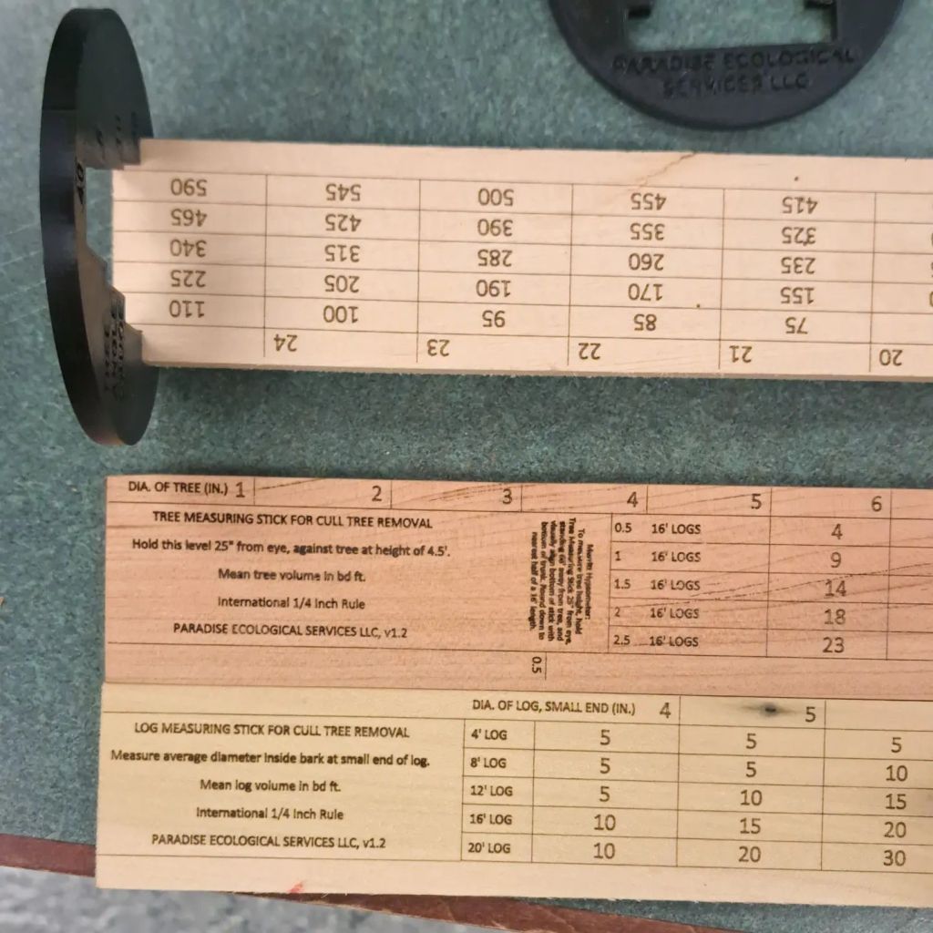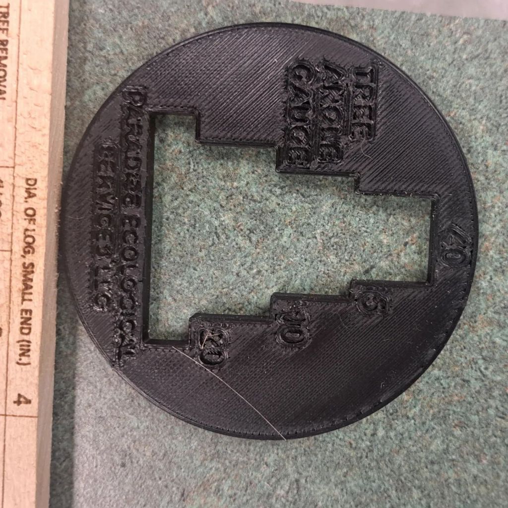 This was manufactured by me and friends working together at the Athens Makerspace, with design sessions happening in our homes. Special thanks to Asa Peller (A-STUDIO) and Henry Hellbusch, as well as Pauline Phillips (our Makerspace guardian angel). It is because of these specialized uses for small roundwood that we started this project, because now the board foot scale on both sides of the measuring stick goes down to half a 16′ sawlog, and uses the International 1/4 Rule- rather than Doyle Rule. Thus we avoid underestimating timber volume from the narrower & shorter logs, which is a classic problem with tree measuring sticks. Because we didn’t need our stick to be 36″ long to measure the diameter of small roundwood, we made it 25″ long. This allows us to attach a 3-D printed angle gauge (a type of crusing prism), for variable radius plot cruising.