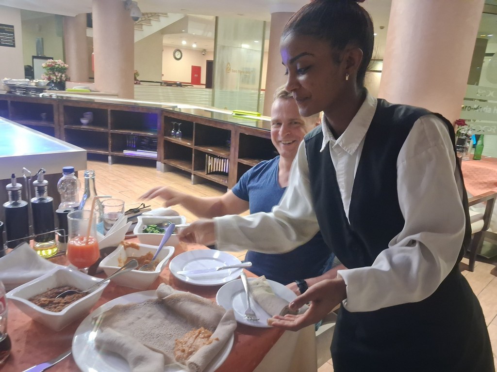 I am going to Quentintino this and start with the finale, which took place at Lidiya Woliata Cultural Restaurant. They brought out injera, corn flatbread with a really nice flavor, roasted enset, enset flatbread, a literally boiling pot of garlic-ginger-chili hot sauce. Then there was the mucho. Oh mucho! Savory couscous made of enset. Then six different dips and sauces and what not, spicy intestine, chicken mole or something, greens and meat, all spectacular and hard to compare to much else I’ve tried. It looks a bit like Indian food but tastes completely different. We ordered mead but the Woliata prefer not to let it ferment past a couple of days, so it was some skunky honey soda basically.
