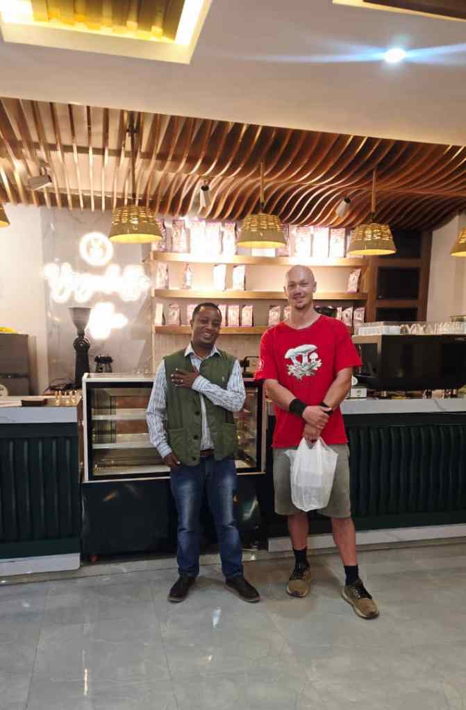 After 5 hours of bed, Preston and I met up at the hotel bar for coffee. The espresso machine is the centerpiece of the bar, and down the hall is a well-lit atrium dedicated to the Ethiopian Coffee Ceremony. More on that later but yeah besides SCUBA, coffee is the reason for our trip!