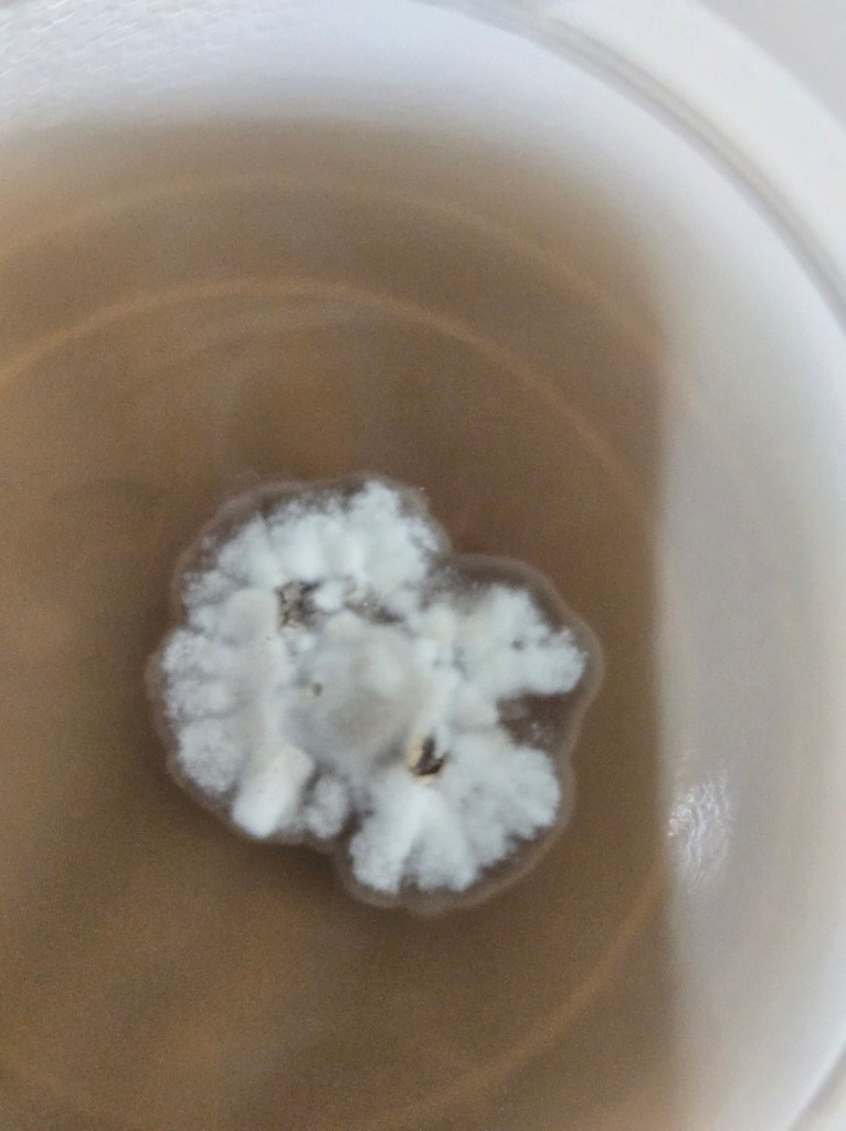 We’re not sure that the liquid mycelial culture couldn’t still work, but we may need to go back to the drawing board in terms of the nutrient recipe. Also, picking the porcini when it’s still in the dense, early button stage, before any worms or discoloration or bacterial composition sets in, seems like a crucial step to ensuring the purity of the strain. Thomas thinks there may be contamination on his June plates, though he has employed various procedures to clean up the plates of suspected unwanted mold, with some success.