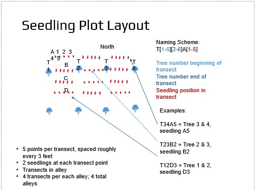 Below is a picture showing our proposed planting layout for the seedlings in the Mother Tree Treatment. We will be planting two nuts per planting space in March. For starters, the milk carton will be labeled. After the seeds sprout, both stems in each milk carton (assuming both seeds successfully germinate and grow) will also be individually labeled in June for redundancy.