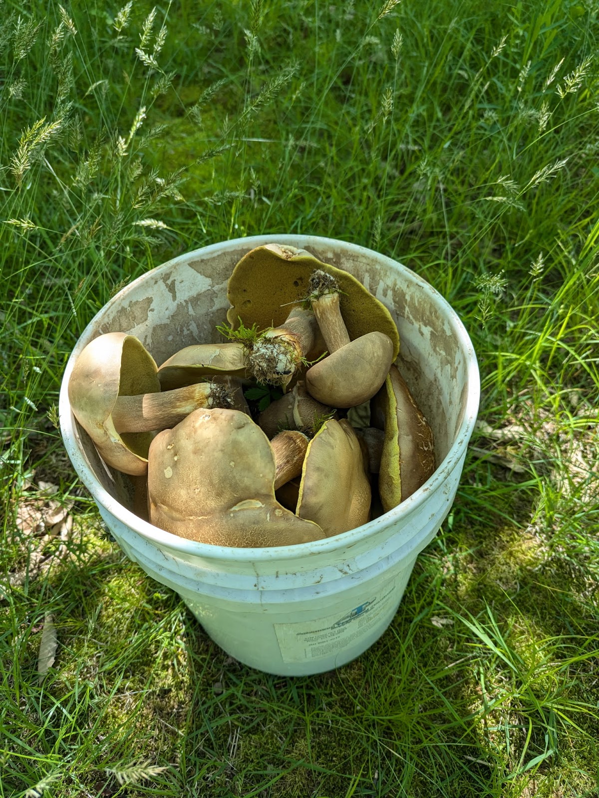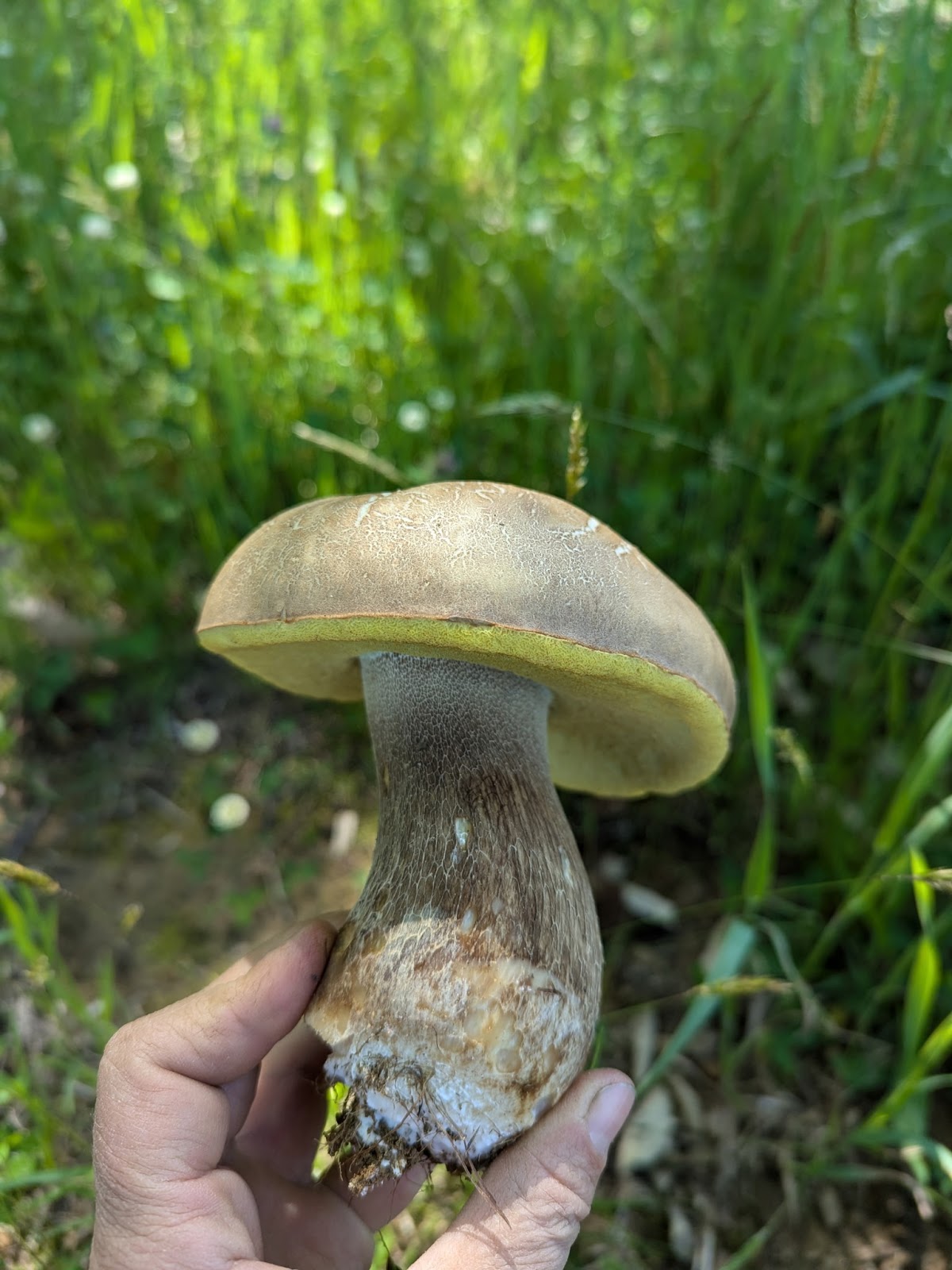 At Martha Bishop’s recommendation, Badger Johnson and Aly Gordon attended a spring 2025 foray with the Ohio Mushroom Society (OMS) in Lake County, OH. OMS is a chapter of the North American Mycological Association (NAMA), and puts out “The Mushroom Log” as a bimonthly newsletter. We suggest to everyone reading this, if you haven’t already, join NAMA and your local chapter! It is of good value, for learning mushrooms on forays, in newsletters, and with many exclusive online classes and lectures. We search the Mushroom Log for King Boletes identification guidelines. Here is some of what we learned: