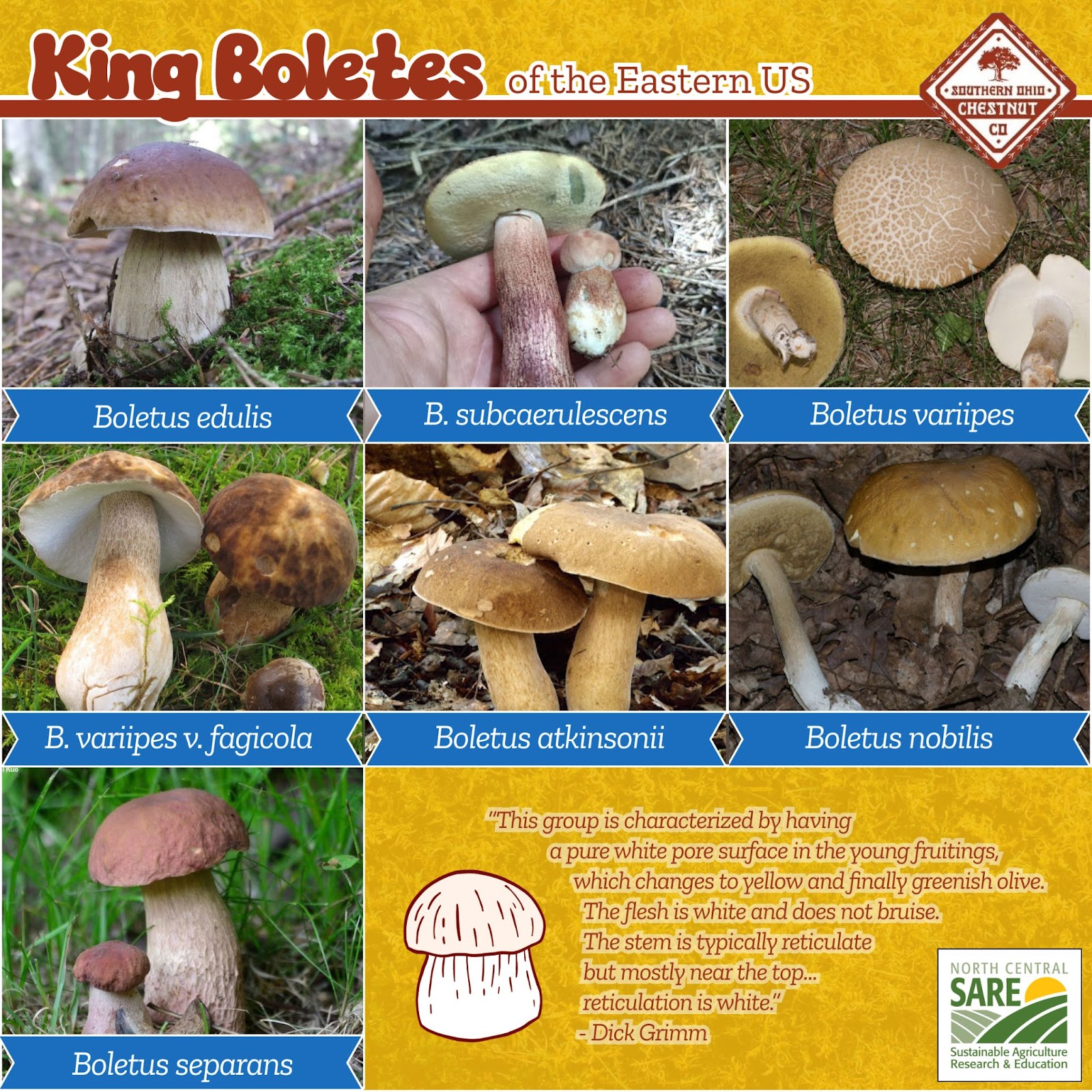 This trend that Mr. Wasilewski described, of geneticists reclassifying every species from genus Boletus that doesn’t look like a King Bolete, has held constant ever since. In the eastern US, genus Boletus now includes only Boletus edulis, Boletus subcaerulescens, Boletus variipes, Boletus separans, Boletus variipes var. fagicola, Boletus atkinsonii and Boletus nobilis– all of which are culinarily considered King Boletes. This is a favorable situation for farmers, field biologists & foragers- all are choice edibles! Dr. Bryn Dentinger lays it out nicely in the chart below in his talk “ Boletus edulis update presented by Dr. Bryn Dentinger (UMNH) via Zoom on November 17 2022”. We made an infographic for the species native to the eastern US.